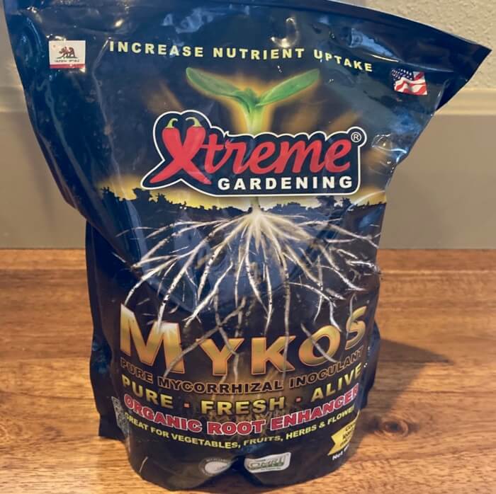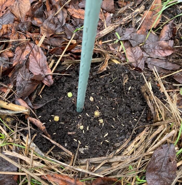 - Mix Mykos (mycorrhizae innoculant) with the peas and plant 5-6 seeds each with annual rye seed.