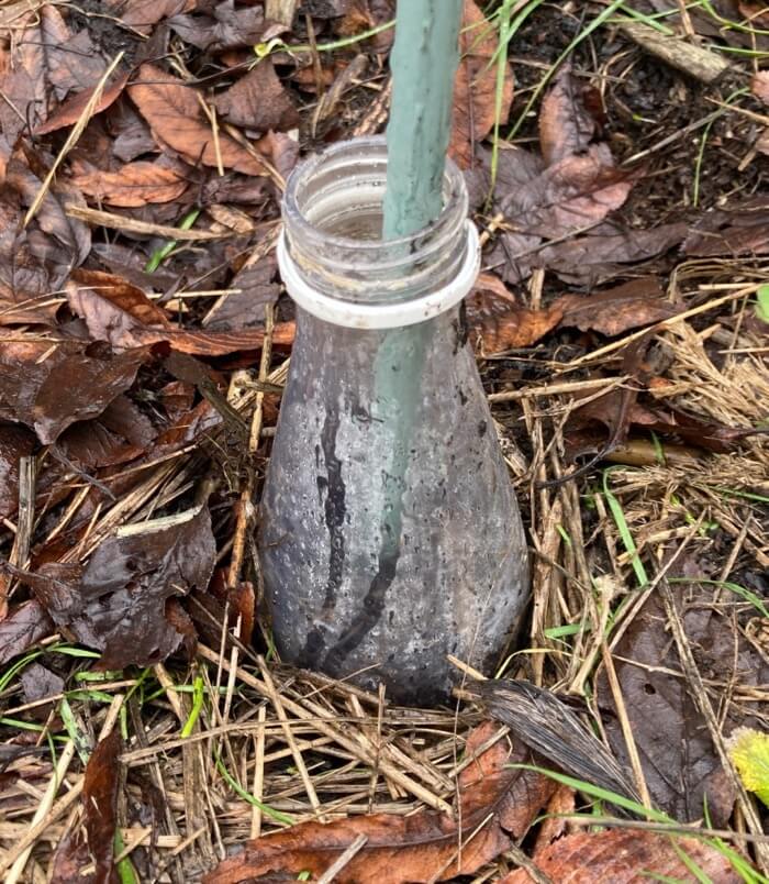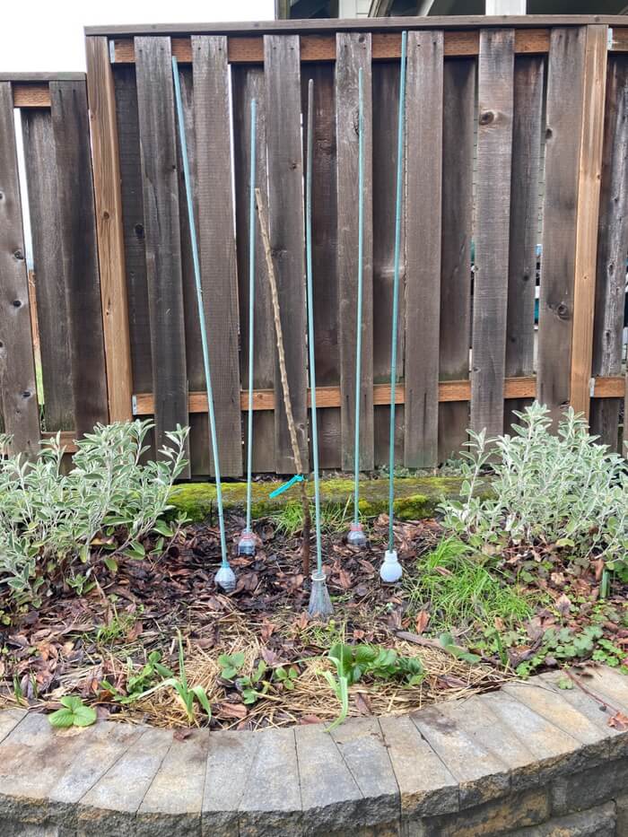 - 支柱を立て、ペットボトルをかぶせる(鳥よけかつ霜対策)。