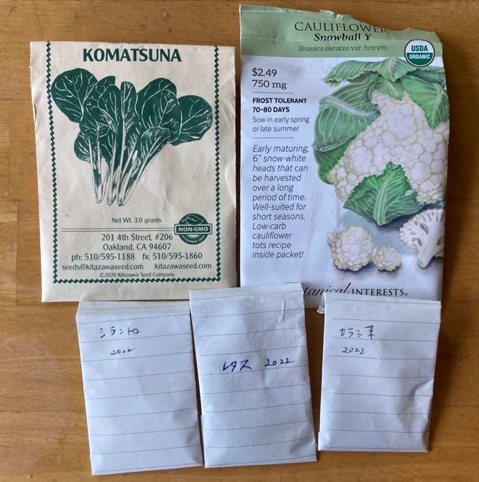 - Sow 2-3 seeds per cell. This time, I planted Komatsu-na (Japanese Greens), lettuce, mustard greens, cilantro and cauliflower.