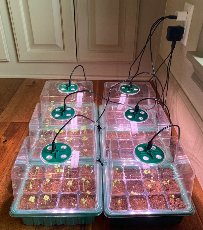 3月13日、家の中で育苗始めました。時期的に、外に直播きもできるんですが、うちの庭には野鳥やモグラ、ナメクジがいっぱいいるので、芽が出ても、双葉のうちに食べられてしまいます。本葉が3枚くらいに育ってから外に植えないと、うまくいきません。野鳥って、緑の葉っぱ食べるんですよー。選り好みして、カラシ菜とシラントロは食べませんけどね。モグラは苗を食べるわけではありませんが、土を掘ってしまうので、近くの苗が抜けたり土中に潜ってしまいます。