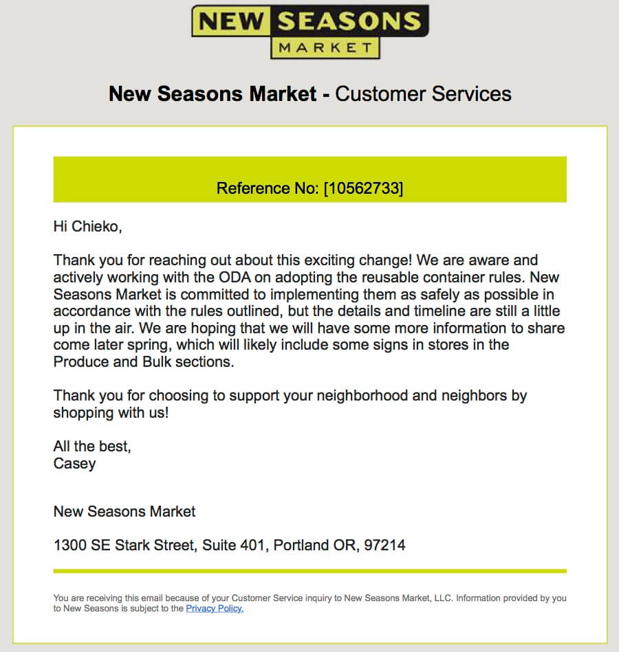 数年前までの1ー2年くらいですが、スーパーにmy容器を持参して、量り売りの食品や野菜、果物を買っていました。COVIDが始まるちょっと前くらいかな?my容器の持ち込みが禁止されてしまいました。州の条例でダメになったのか、査察が入ってダメということになったのかわかりませんが。最近のニュースで知ったのですが、オレゴン州のスーパーでは、今年の2月からmy容器持ち込みOKになりました(店の方針で可能かどうか決まる)。そこで、私の大好きなローカルスーパーのNew Seasons Marketにmy容器の持ち込みができるようになるのか聞いてみました。その回答がこれです。
