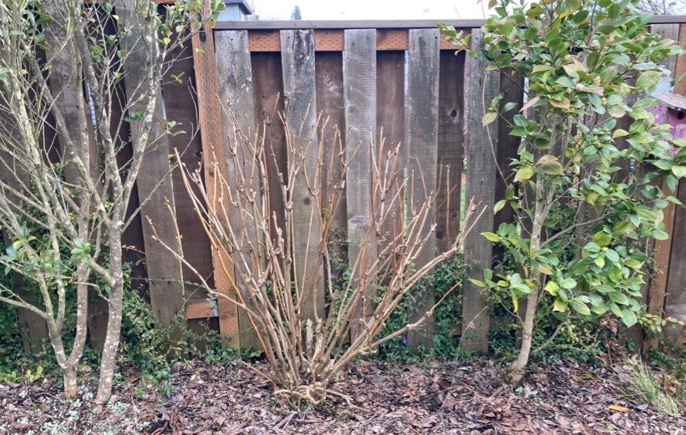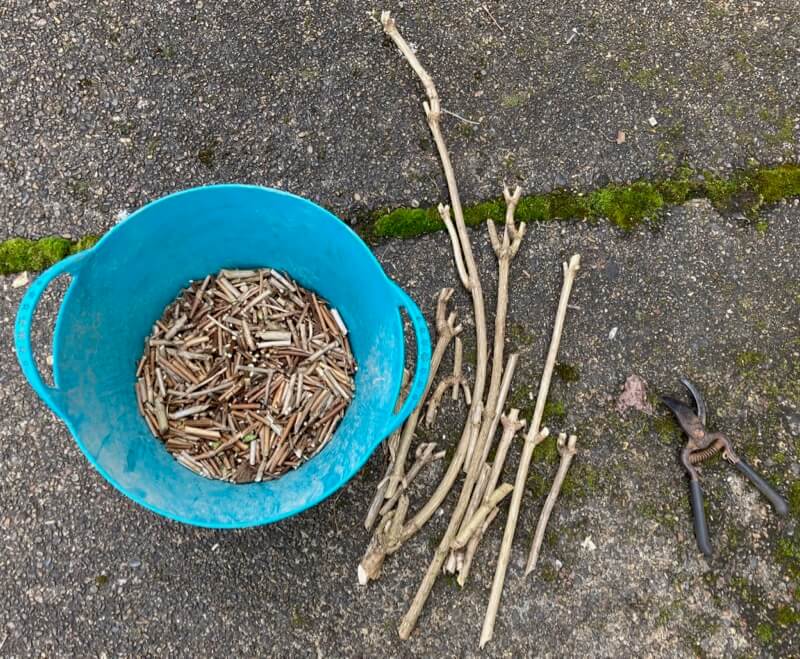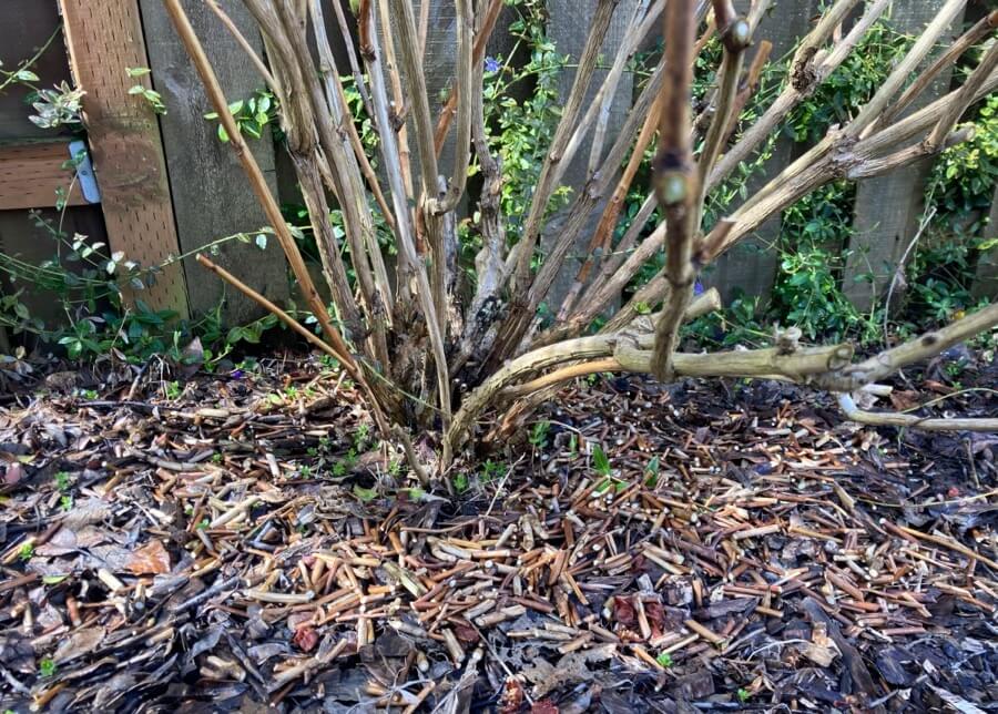 アジサイを剪定したらスッキリ。今年は、死んでる枝を取り除いて、芽が出始めたところまで切るだけの軽い剪定。剪定された細い枝は3cmくらいに切って、アジサイの根元に返してあげました。