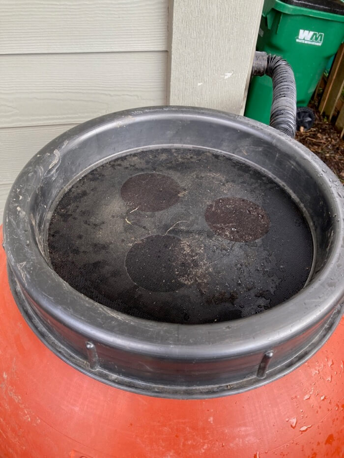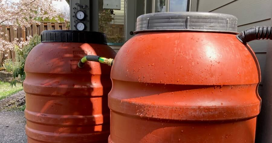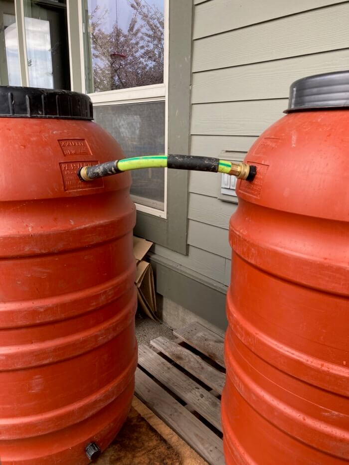 昨年購入して始めた雨水タンク。自分で一から作ればすごく安上がりですが、さすがに大変。。。なので、すでに蛇口とホース口が取り付けられたものを購入しました。我が家のシステムは、二つの58ガロン(220L)タンクを直列に繋いだものです。屋根に降った雨水が雨どいに集まり下水に流れて行きますが、雨どいと下水を繋ぐパイプの途中から、その雨水をとっています。二つのタンクは上部でホースで繋がれており、一つ目のタンクがいっぱいになったら(ホースのつなぎ目まで水位が上がったら)、二つ目のタンクに水が流れるようになっています。両方のタンクがいっぱいになると、雨どいからパイプを流れてくる雨水はそのまま下水に落ちて行くような仕組みになっています。だからオーバーフローのホースは繋いでいません。タンクの上部には、三つ穴の空いたトレイとその上に網がつけられていて、蚊が入らないようになっています。ちなみにこのタンク、元はギリシャ産オリーブオイルの樽だったようです。