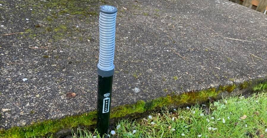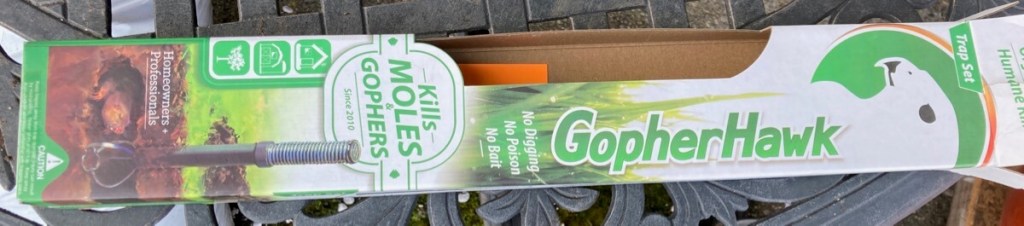 二つ目は、 ストラップ型の罠。三つの金属ストラップの真ん中にプローブが付いてます。これにモグラが触れると、金属ストラップがプラスチックパイプに引き込まれ、モグラが挟まる仕組み。穴を掘らなくても設置できるので楽チンです。