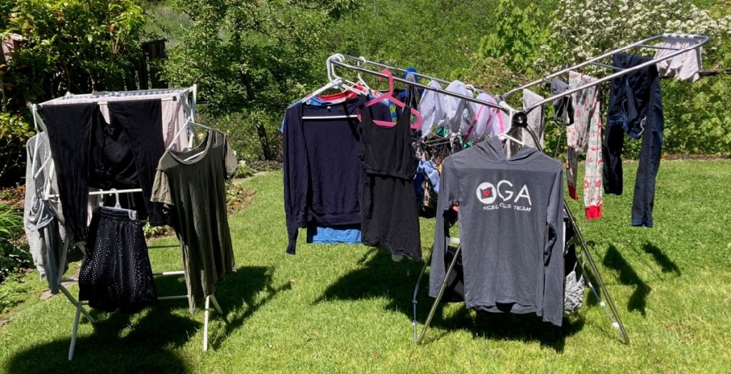 うちの娘ども、洗濯物の干し方すら知りませんでした😱そりゃ、そうか。教えたことなかったからねぇ。もしかしてもしかすると、多くのアメリカ人は洗濯物を干したことがない???娘たちは4年経ってめでたく、そこそこ洗濯物干しができるようになりました。ちなみに、私の小学生の時の夏休みのお手伝いは毎年、洗濯物の脱水(昔は洗濯槽と脱水槽が別だった)と洗濯物干しでした。そうすると、母が洗濯機を回した後、すぐに仕事に行けたんですね♬
