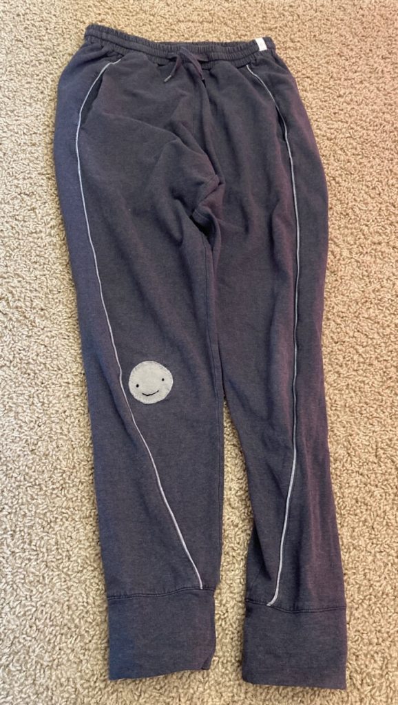 Start with sweat pants. First, make two patches and embroider a face on one of them. I used a leftover cloth from the body pillow cover I made before. Because it is a stretch material, it can be used as patches for T-shirt and sweat pants.
