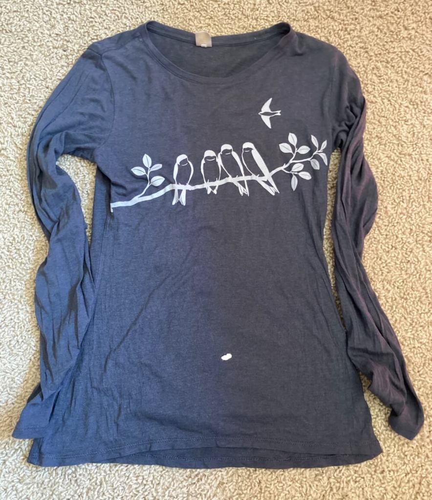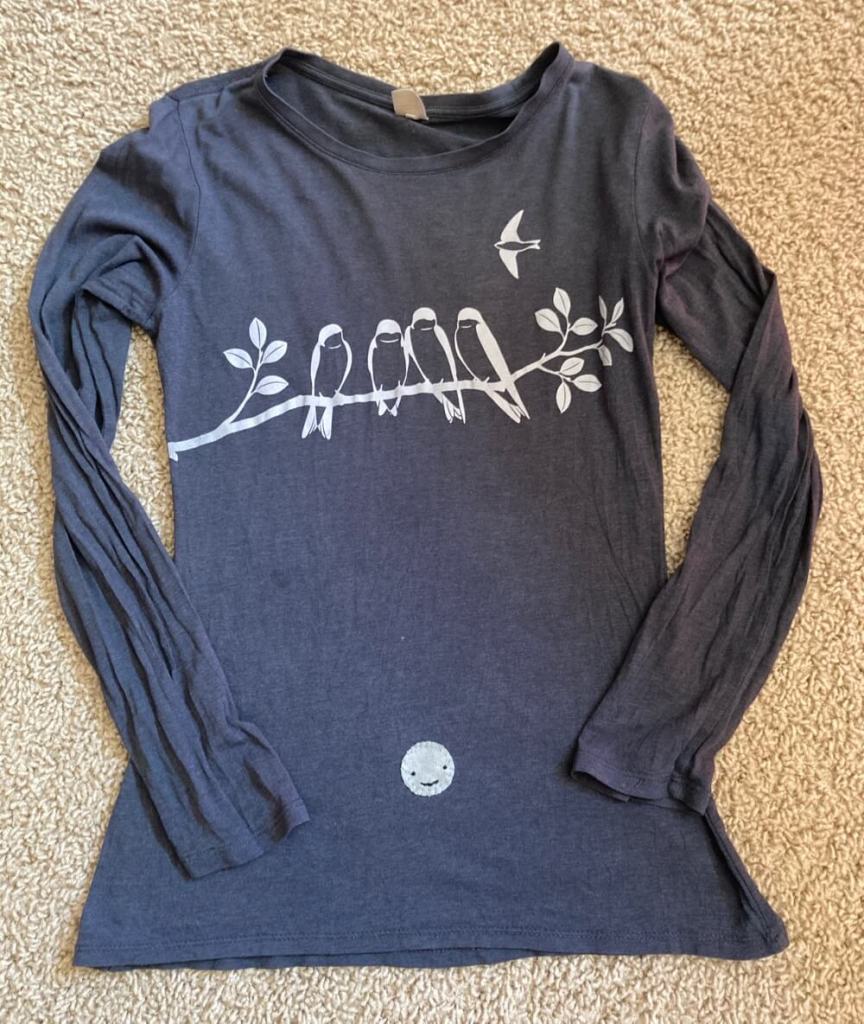 Tシャツも同じように修繕。ジャーン。完成。使ってないポケットから共布を取ったり、長いTシャツの裾を短くして共布を取ることもできたのですが、今回は茶目っ気を入れてみました。(お願い!ダサいって言わないで。ダサかわいいですよ)。