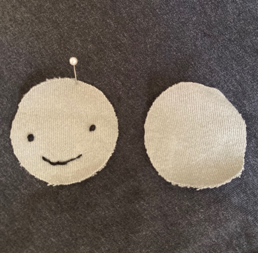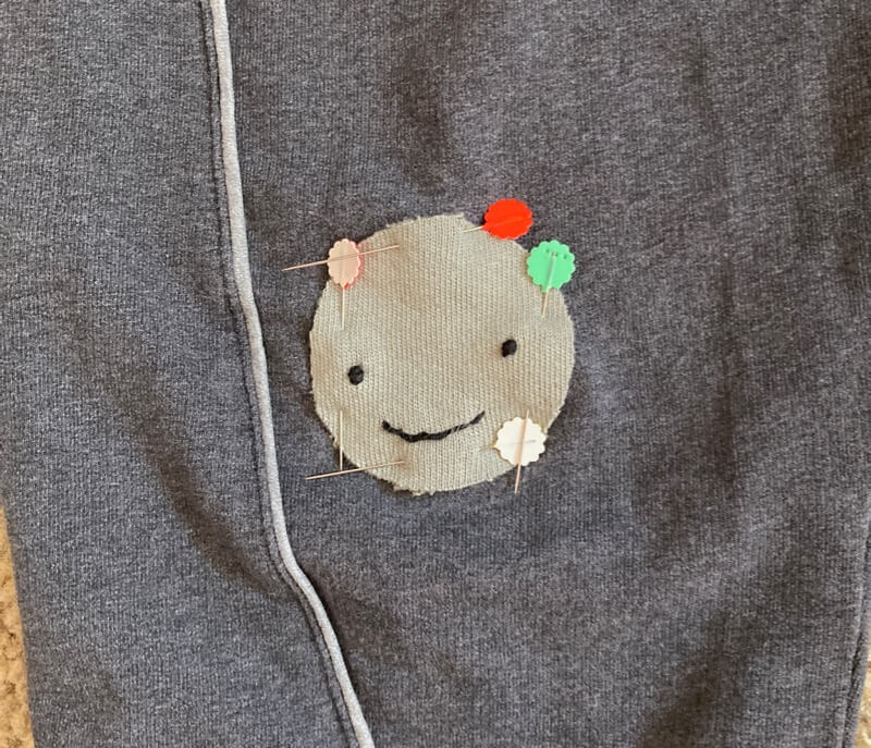 まずはズボンから。最初に、パッチを2枚作って、表にくる方には顔を刺繍する。パッチは、以前作った抱き枕のカバーの残り布を使っています。ストレッチ素材なのでTシャツやジャージのパッチに最適。