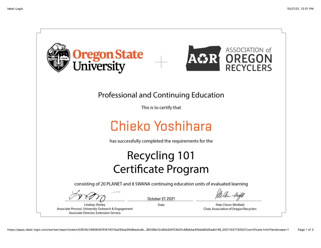 The reason why I decided to take this program…. is because my neighbor is a married couple who are very interested in recycling. The wife, Jen, and I always take items to events for things that can’t be put in the curbside recycling cart. There’s a lot, and it’s a pain to sort it by type and plastic number (Is this how garbage is sorted in Japan maybe?). Why are two talented women, one graduated from the University of Tokyo and the other from Massachusetts Institute of Technology, going through so much trouble? (Or are we just study idiots???) The system is definitely wrong! So, since my schedule matched the schedule of the program that only takes place once a year in Washington County, I decided to study (Since I am study idiot, I solve a problem by studying.)