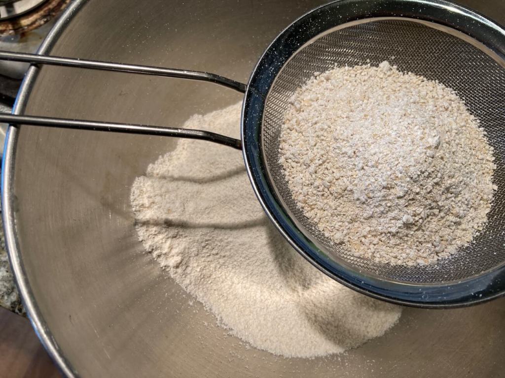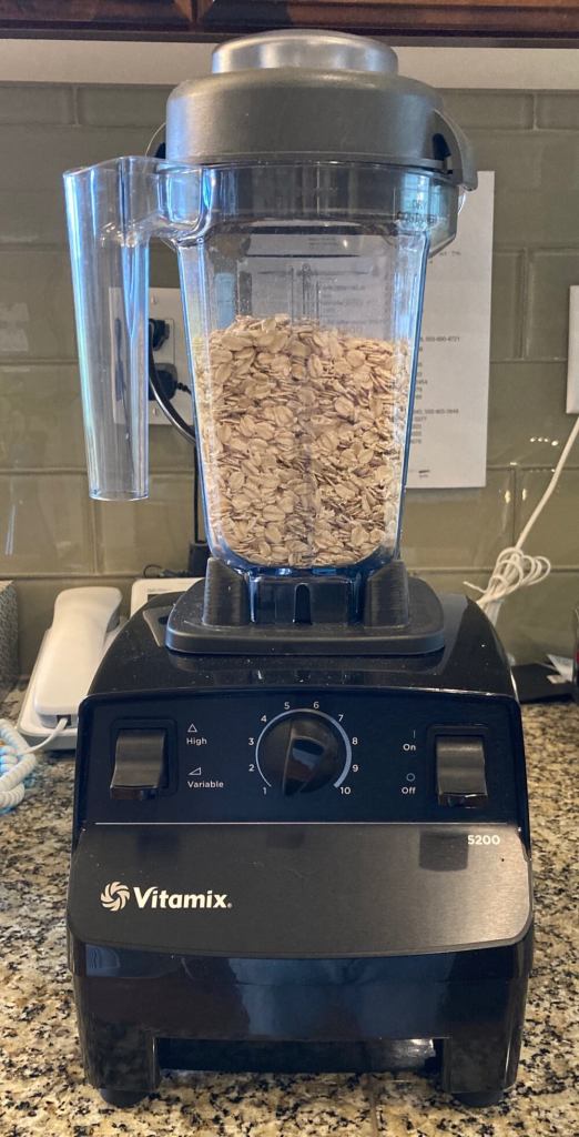 - オーツ麦粉:アメリカでは普通にスーパーで売っていますが、うちではオーツ麦をオートミールにして食べることもあるので、押しつぶしたオーツ麦を25ポンド(11kg)の大袋で買っています。粉が必要なときはその都度挽くことでパッケージを減らすことができるし、収納スペースも削減できます。さらに、新鮮な粉で作るので美味しいものができます。粉を挽くのにはVitamixの乾物用を使用しています。挽いた粉は店で買ったものと比べてキメが粗いですが、そのままでもクッキーやマフィンには使えます。逆に不均一なため空気が入り込み、面白い食感になります。網に通すとキメが細かくなり、クッキーの表面が均一でなめらかになるので、出来上がりの見た目は美しくなります。