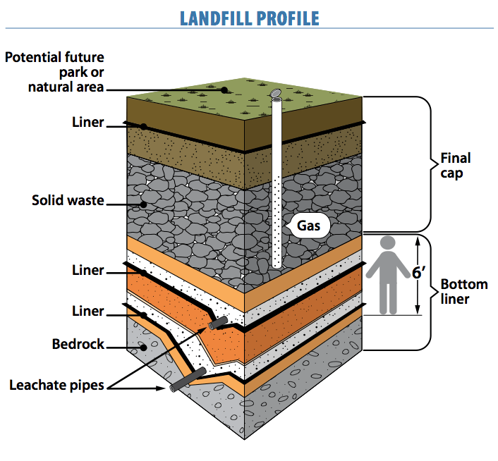 アーリントンのゴミ埋め立て処理場は1990年に始動された比較的新しい設備です。降水量が年間9インチと少なく、地下水が200フィートと深いので、浸出液が漏れて地下水が汚染される危険性がとても低いです。また、地下水は汚染されていないか常時モニターされているようです。ライナーは厚さ6cmのポリエチレンでできています。会社のウェブサイトによるとこの施設はあと120年は使えるということです。