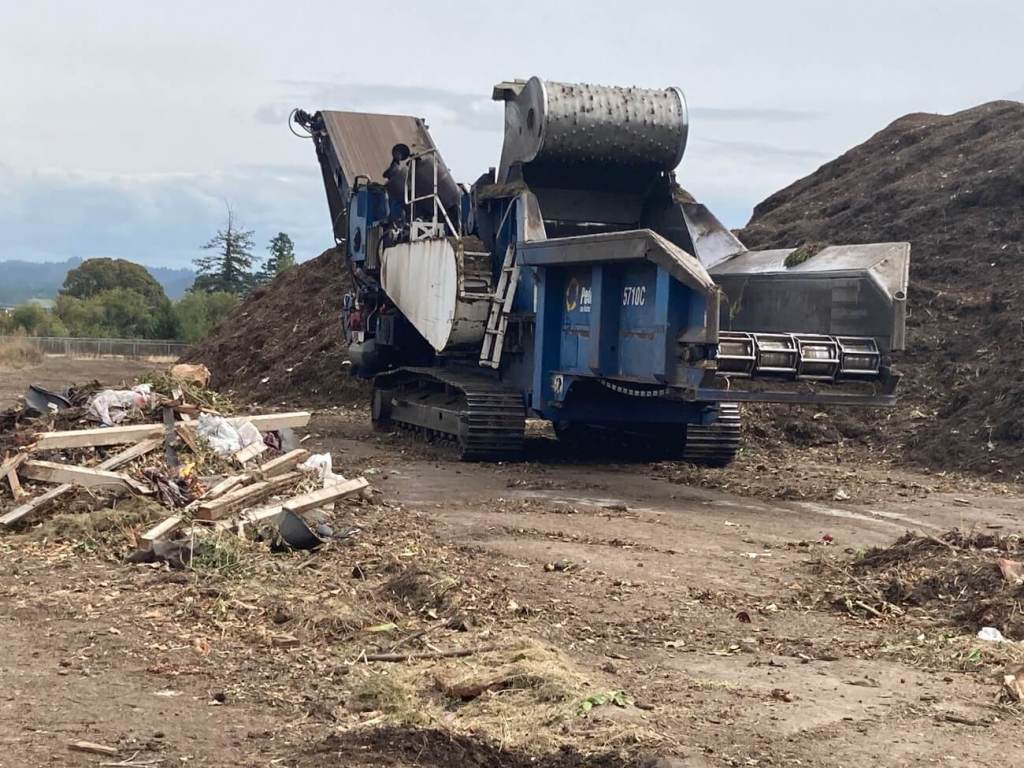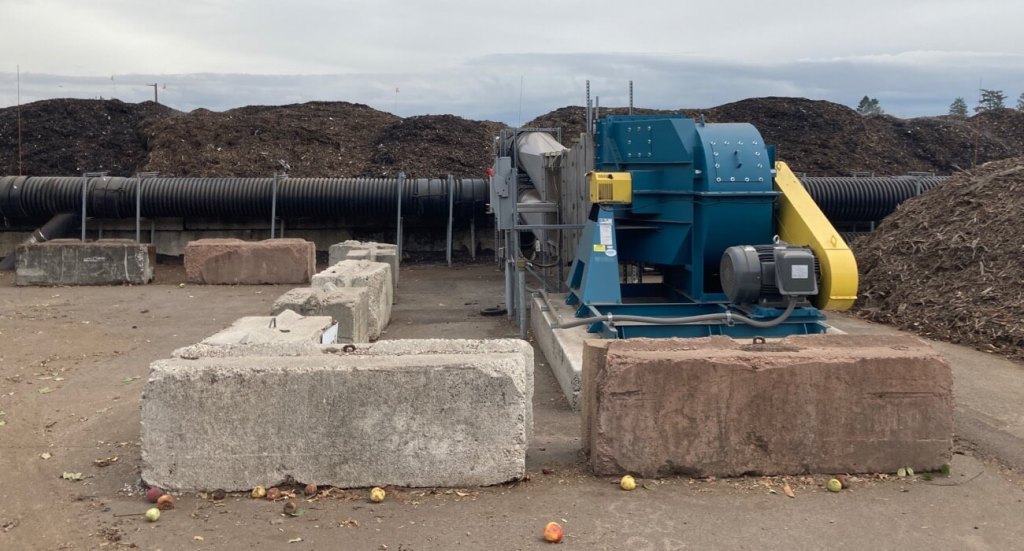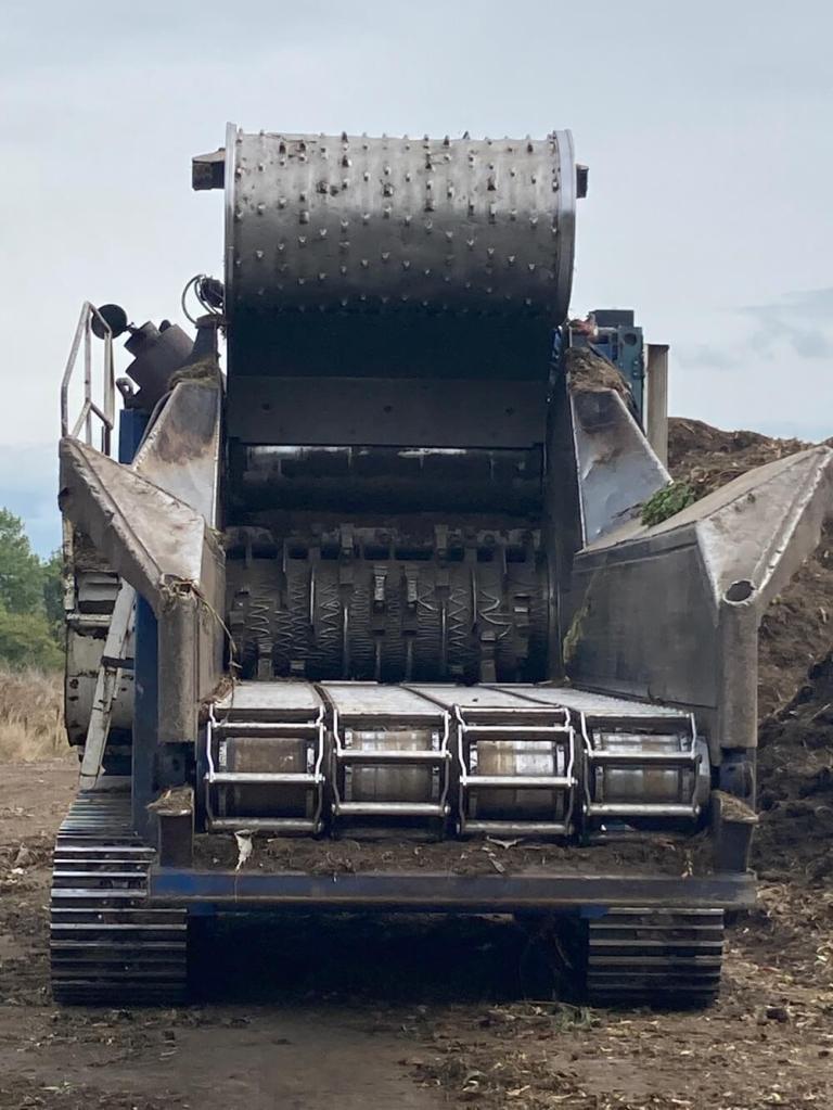 集められた庭ゴミ+生ゴミはまず機械(グラインダー)で粉々にされます。そうすると表面積が増え微生物によって分解されやすくなり、短期間でコンポストに変わります。この施設では3ヶ月ほどで販売用コンポストになるそうです。機械の左側にあるのはプラスチックや木材などのゴミです。こういったコンタミは避けられませんが、手で取り除かなければならないため余分な手間と人件費がかかります。