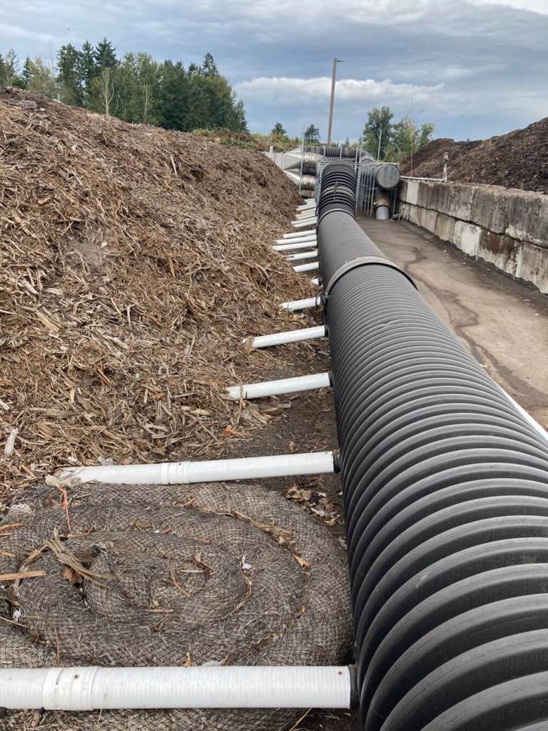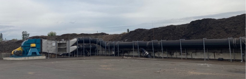 機械で粉々にされた有機物はうね状に積み上げられます。このうねの下にはいくつものパイプが通っていて陰圧で空気を引き込んでいます。引き込まれたガスはバイオフィルターのうねに送り込まれます。バイオフィルターはバークチップが積み重ねられたようなものですが、そこを通る時に臭い分子が吸収され、微生物によって分解されます。コンポストは好気性分解なので、どうにか空気を通さないといけないのですが、陰圧で空気を引き込んでいるのは面白いですね。またこのうねも定期的に移動させています。そうすることで、有機物が混ざり空気も入り、さらに分解が進みます。コンポストのうねもフィルターのうねも温度計と湿度計でモニターされています。