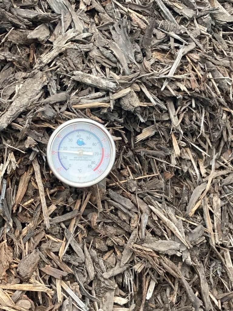 温度が上がったり湿度が下がったりしたら水をまきます。おうちでコンポストをしている方はご存知のように、温度と湿度がいい具合だと微生物が元気に有機物を分解してくれるので早くコンポストが出来上がります。温度が上がりすぎる(140℉以上)と微生物が死んでしまう😢ので、水をかけたりパイルをひっくり返したりして温度を下げないといけません。