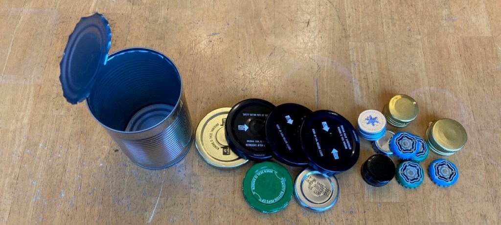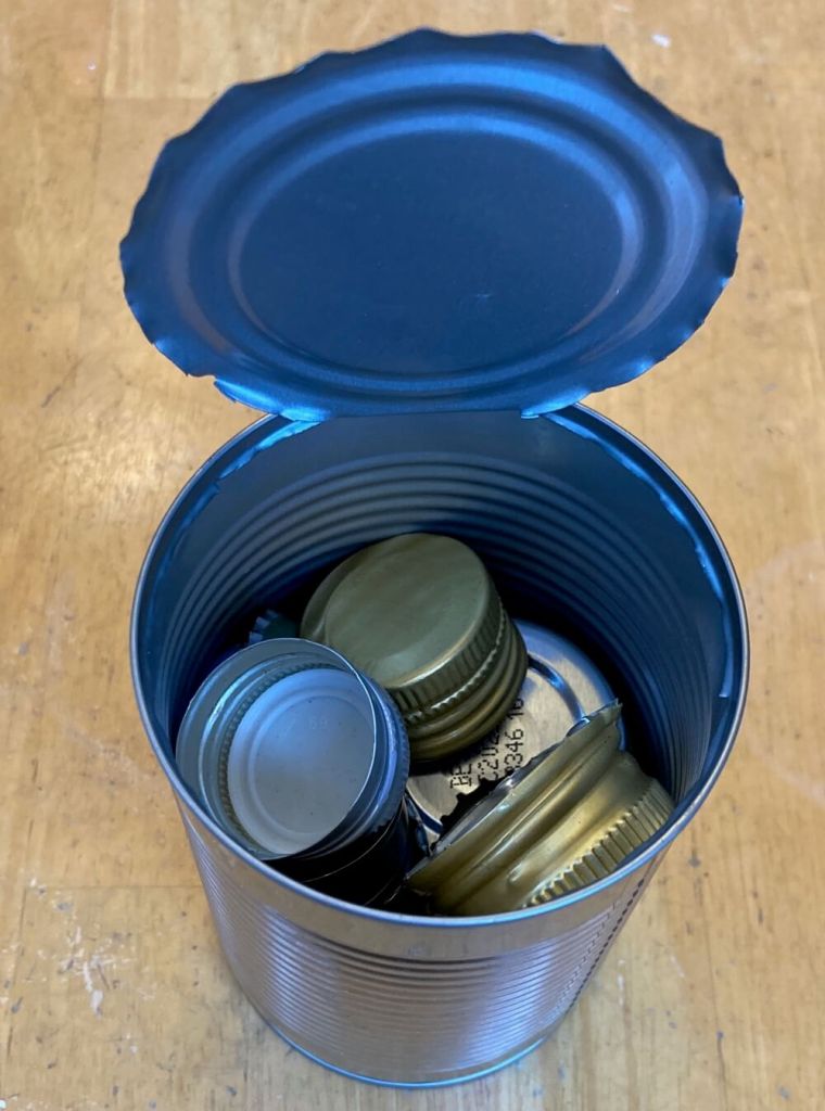 1. Place rinsed metal lids into a larger metal container, such as a steel can.