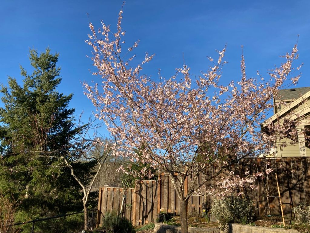 Yesterday, in just one day, our cherry blossoms jumped from 0% to 10%. And today, in just one day, 70%! I can see the tree from my dining table, and while I was eating, they were blooming one after another, and it was like watching a video in fast forward.