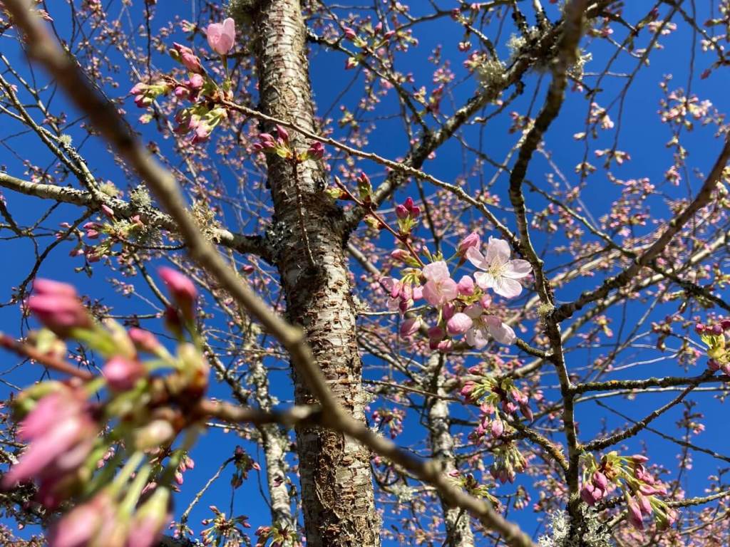 去年がラニーニャで寒くて今年がエルニーニョで暖かいので、満開の時期に3週間以上のずれがありそうですね。もしかすると明日にも満開😉