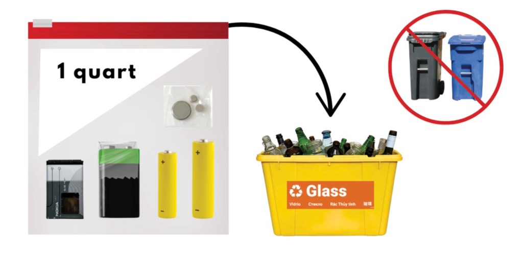 私が住んでいるワシントン郡では電池はリサイクルできます(リサイクルのカートには入れません)。アルカリ電池以外は透明のテープを電極部に貼ります。1クォートのビニール袋に入れてガラス用の収集容器のガラスの上に置いてください。
